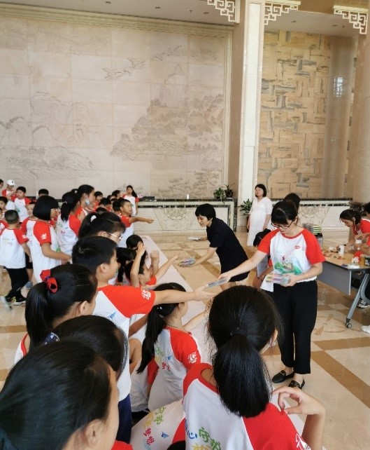 (圖為 工作人員為小朋友分發(fā)畫(huà)筆)