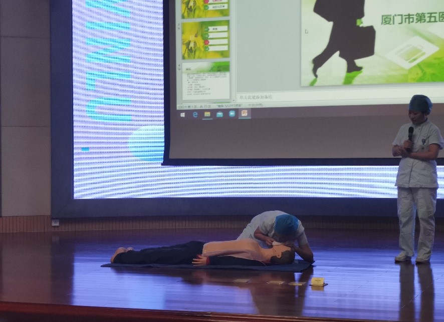 講座現(xiàn)場(chǎng), 張護(hù)士長(zhǎng)及其團(tuán)隊(duì)的優(yōu)秀護(hù)士們攜帶了人體模型,認(rèn)真演示了人工呼吸、心肺復(fù)蘇急救法的動(dòng)作規(guī)范,通過(guò)情景互動(dòng)方式,讓員工了解如何判斷現(xiàn)場(chǎng)環(huán)境是否安全,通過(guò)角色扮演加強(qiáng)印象,讓每個(gè)人有練習(xí)的機(jī)會(huì)。